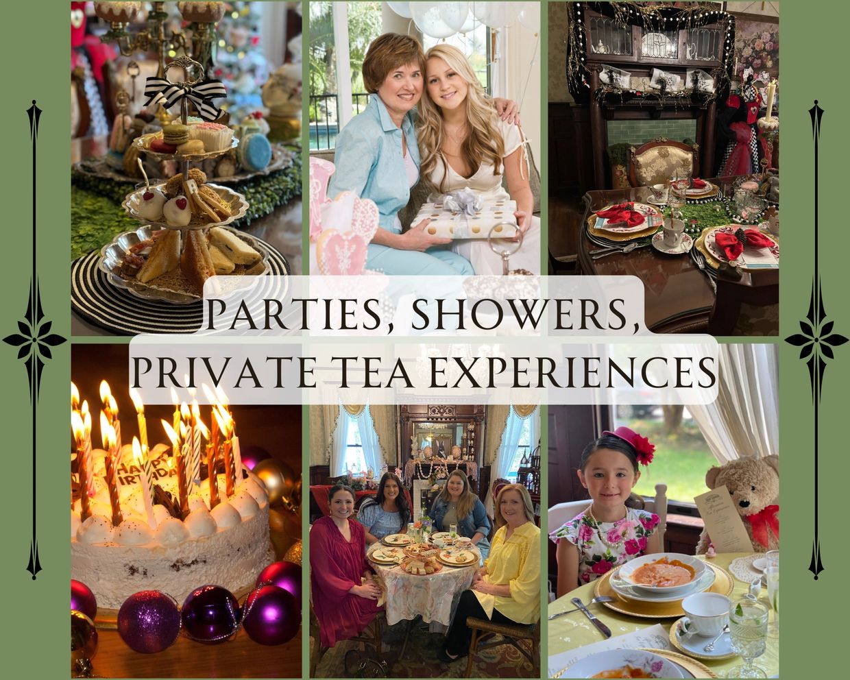 For your full service experience, choose to have a Lunch, Brunch, Tea Party, or Dinner.