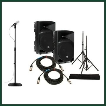 Includes two 1000 watt Mackie speakers and stands, 1 Mackie sound board, two corded microphones and setup and tear down.