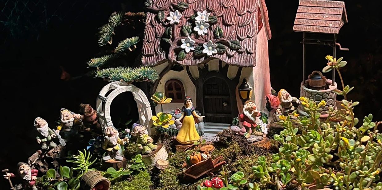The path is lined with fairy gardens inspired by classic tales like Cinderella, Peter Pan, and other timeless favorites — each brought to life with whimsical details and seasonal touches.